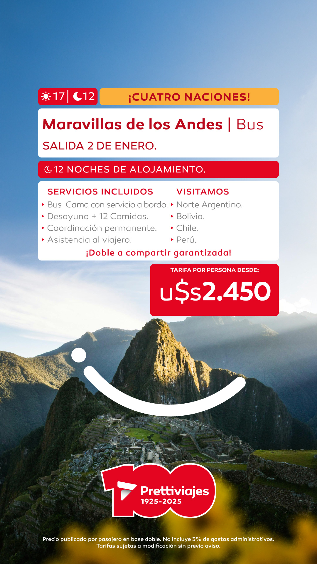 Flyers Home Flyers Flyers Bus Catamarca - Noviembre (Bus) *Click en la imagen para descargar Cataratas - Noviembre (Bus) *Click en la imagen para descargar Cataratas - Diciembre (Bus) *Click en la imagen para descargar Caviahue, Copahue y Pehuenia (Bus) *Click en la imagen para descargar Puerto Madryn - Noviembre (Bus) *Click en la imagen para descargar Mar del Plata (Bus) *Click en la imagen para descargar Villa Gesell (Bus) *Click en la imagen para descargar Pinamar (Bus) *Click en la imagen para descargar San Bernardo (Bus) *Click en la imagen para descargar Mendoza - noviembre (Bus) *Click en la imagen para descargar Piriápolis - uruguay (Bus) *Click en la imagen para descargar La Paloma - uruguay (Bus) *Click en la imagen para descargar Cataratas - Carnavales (Bus) *Click en la imagen para descargar Cataratas - enero a marzo (Bus) *Click en la imagen para descargar Puerto Madryn - Enero (Bus) *Click en la imagen para descargar Puerto Madryn - Febrero (Bus) *Click en la imagen para descargar Sur Chileno (Bus) *Click en la imagen para descargar Sur Chileno - Marzo y Abril (Bus) *Click en la imagen para descargar Norte - Febrero y Marzo (Bus) *Click en la imagen para descargar Sur Chileno (Bus) *Click en la imagen para descargar Sur Chileno - Marzo y Abril (Bus) *Click en la imagen para descargar Verano 2026 Verano 2026 Canasvieiras (Bus) *Click en la imagen para descargar Verano 2026 Bombinhas (Bus) *Click en la imagen para descargar Verano 2026 Camboriú (Bus) *Click en la imagen para descargar Verano 2026 Canasvieiras (Bus) *Click en la imagen para descargar Verano 2026 Bombinhas (Bus) *Click en la imagen para descargar Verano 2026 Camboriú (Bus) *Click en la imagen para descargar Bombas - Brasil (Aéreo) *Click en la imagen para descargar Canasvieiras (Aéreo) *Click en la imagen para descargar Camboriú (Aéreo) *Click en la imagen para descargar Sur de Brasil (Aéreo) *Click en la imagen para descargar Perú Cautivante (Aéreo) *Click en la imagen para descargar Maravillas de los Andes - 4 naciones (Aéreo) *Click en la imagen para descargar Flyers Aéreos Bariloche + Villa La Angostura (Aéreo) *Click en la imagen para descargar Bariloche- 18 noviembre (Aéreo) *Click en la imagen para descargar Bariloche- 22 Noviembre (Aéreo) *Click en la imagen para descargar El Calafate- Enero y Febrero (Aéreo) *Click en la imagen para descargar Bariloche - 4nts (Aéreo) *Click en la imagen para descargar Bariloche - Marzo y Abril (Aéreo) *Click en la imagen para descargar Ushuaia + El Calafate - Enero (Aéreo) *Click en la imagen para descargar Bariloche - 5nts (Aéreo) *Click en la imagen para descargar Flyers Internacionales / Regionales Rio de Janeiro - 2026 (Aéreo) *Click en la imagen para descargar Sur de Brasil (Aéreo) *Click en la imagen para descargar buzios - 2026 (Aéreo) *Click en la imagen para descargar Bombas - Brasil (Aéreo) *Click en la imagen para descargar Canasvieiras (Aéreo) *Click en la imagen para descargar Camboriú (Aéreo) *Click en la imagen para descargar Imbassaí - Brasil (Aéreo) *Click en la imagen para descargar Salvador de Bahía (Aéreo) *Click en la imagen para descargar Costa do Sauipe - Brasil (Aéreo) *Click en la imagen para descargar Punta Cana 2026 (Aéreo) *Click en la imagen para descargar Argentina, Bolivia y perú (Aéreo) *Click en la imagen para descargar Maravilla de Italia (Aéreo) *Click en la imagen para descargar Dubai para ellas (Aéreo) *Click en la imagen para descargar Egipto + Dubai (Aéreo) *Click en la imagen para descargar Europa Mágica + Londres (Aéreo) *Click en la imagen para descargar Circuitos Mercados navideños - alemania (Circuito) *Click en la imagen para descargar Año nuevo en Nueva York (Circuito) *Click en la imagen para descargar Mundial 2026 - Argentina (Circuito) *Click en la imagen para descargar